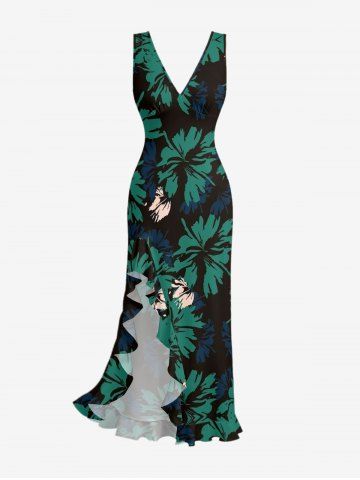 Flowers Print Hawaii Ruffles Split Surplice Dress - Deep Green - M