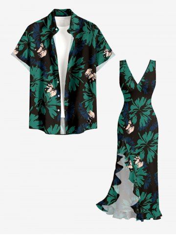 Flowers Print Hawaii Ruffles Split Surplice Dress - Deep Green - Xl