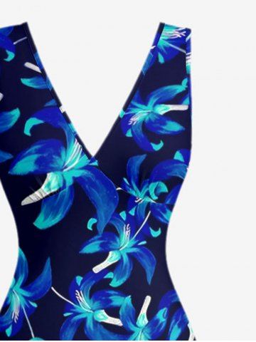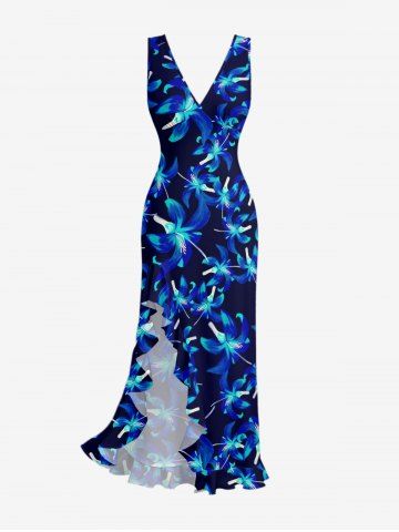 Flowers Print Hawaii Ruffles Split Surplice Dress - Blue - Xl