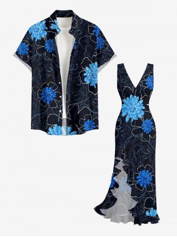 Flowers Print Hawaii Ruffles Split Surplice Dress - Black - M