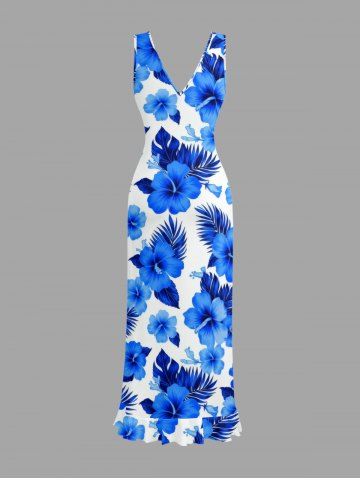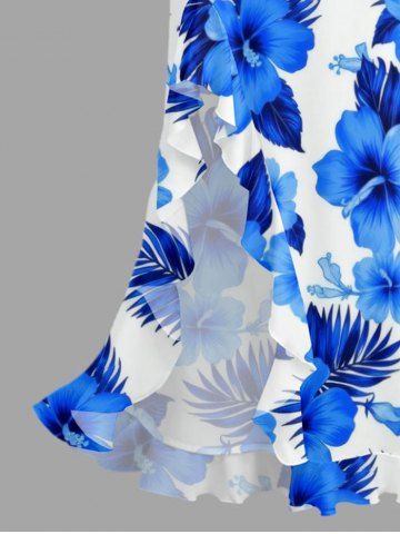 Hibiscus Flower Tropical Leaf Print Hawaii Ruffles Split Surplice Dress - Sky Blue - Xxxl