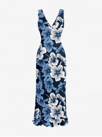 Hibiscus Flowers Print Hawaii Ruffles Split Surplice Dress - Deep Blue - Xxl