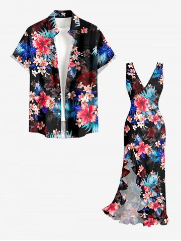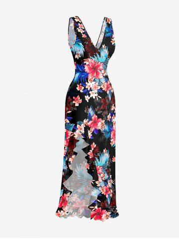 Hibiscus Flowers Tropical Leaf Print Hawaii Ruffles Split Surplice Dress - Black - S