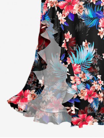 Hibiscus Flowers Tropical Leaf Print Hawaii Ruffles Split Surplice Dress - Black - L