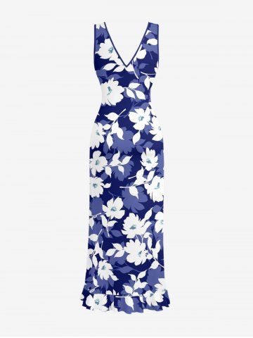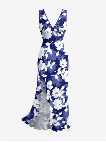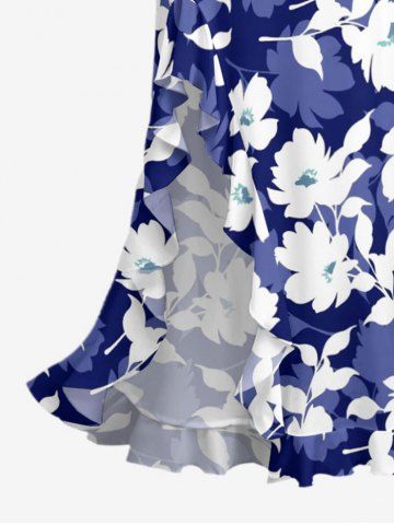 Hibiscus Flowers Tropical Leaf Print Hawaii Ruffles Split Surplice Dress - Blue - Xxl