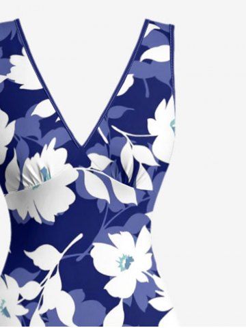 Hibiscus Flowers Tropical Leaf Print Hawaii Ruffles Split Surplice Dress - Blue - Xxxl