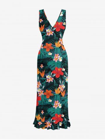 Hibiscus Flowers Tropical Leaf Print Hawaii Ruffles Split Surplice Dress - Deep Green - M