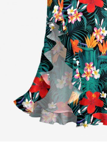 Hibiscus Flowers Tropical Leaf Print Hawaii Ruffles Split Surplice Dress - Deep Green - L