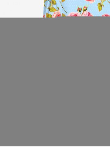 Rose Flowers Leaf Print Hawaii Ruffles Split Surplice Dress - Light Blue - Xs
