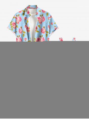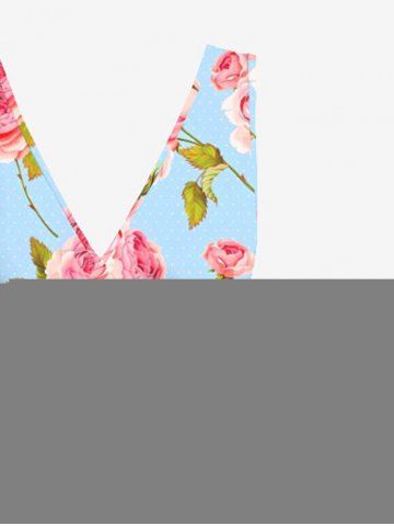 Rose Flowers Leaf Print Hawaii Ruffles Split Surplice Dress - Light Blue - S