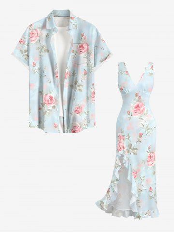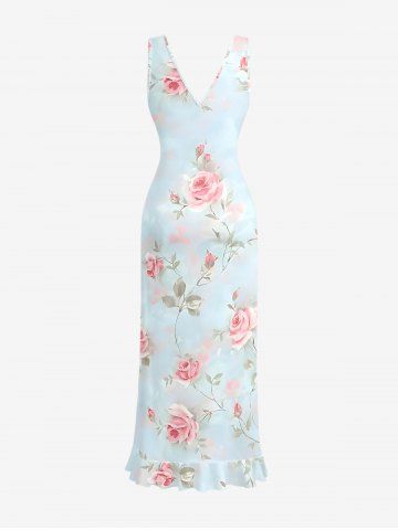 Rose Flowers Leaf Print Hawaii Ruffles Split Surplice Dress - Light Blue - Xs