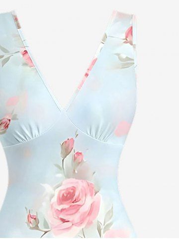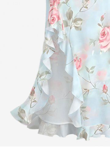 Rose Flowers Leaf Print Hawaii Ruffles Split Surplice Dress - Light Blue - Xxxl