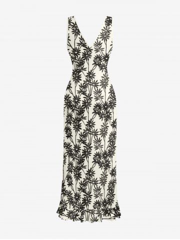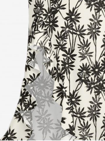 Silhouette Flower Print Hawaii Ruffles Split Dress - Beige - Xxxl