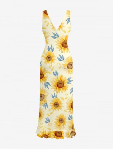 Sunflowers Leaf Print Hawaii Ruffles Split Surplice Dress - Yellow - Xs
