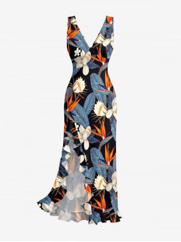 Bodycon Dresses > Tropical Leaf Flower Print Hawaii Ruffles Split Dress
