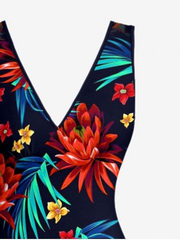 Tropical Leaf Flower Print Hawaii Ruffles Split Dress - Black - Xs