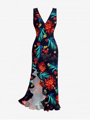 Bodycon Dresses > Tropical Leaf Flower Print Hawaii Ruffles Split Dress