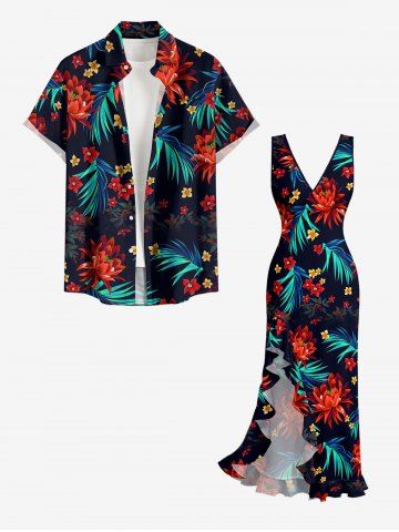 Tropical Leaf Flower Print Hawaii Ruffles Split Dress - Black - L