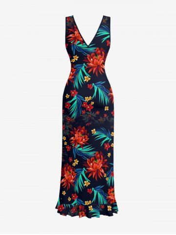 Bodycon Dresses > Tropical Leaf Flower Print Hawaii Ruffles Split Dress