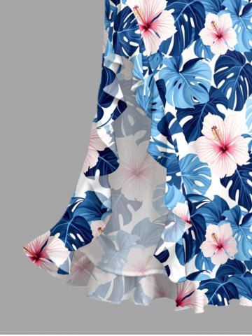Tropical Leaf Hibiscus Flower Print Hawaii Ruffles Split Dress - Blue - Xl
