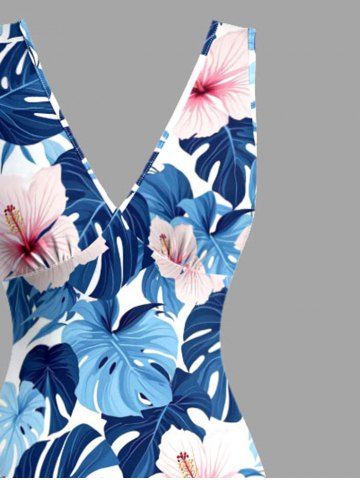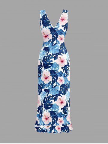 Tropical Leaf Hibiscus Flower Print Hawaii Ruffles Split Dress - Blue - Xxxl