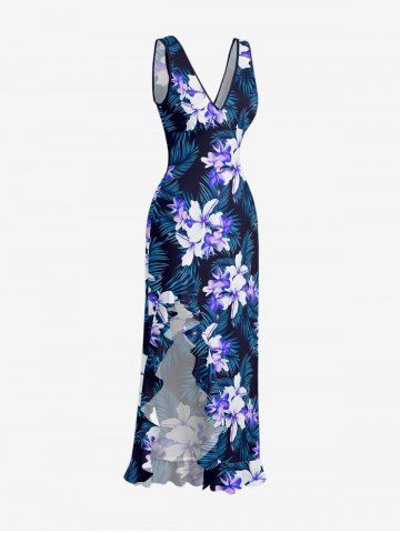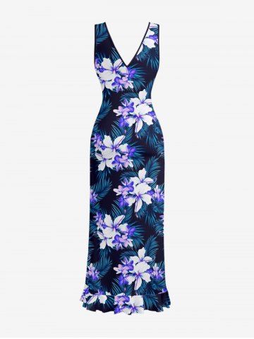 Tropical Leaf Hibiscus Flower Print Hawaii Ruffles Split Dress - Deep Blue - S