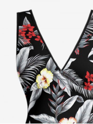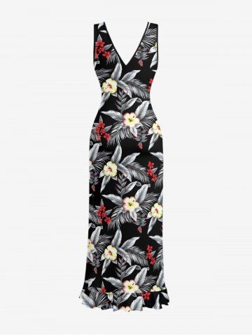 Tropical Leaf Hibiscus Flower Print Hawaii Ruffles Split Dress - Black - L
