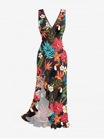 Tropical Leaf Hibiscus Flower Print Hawaii Ruffles Split Dress - Deep Coffee - M