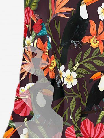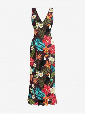 Tropical Leaf Hibiscus Flower Print Hawaii Ruffles Split Dress - Deep Coffee - L