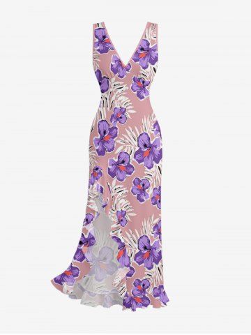 Tropical Leaf Hibiscus Flower Print Hawaii Ruffles Split Dress - Rose - Xs