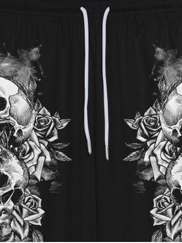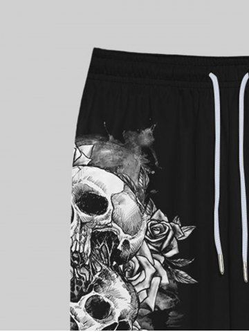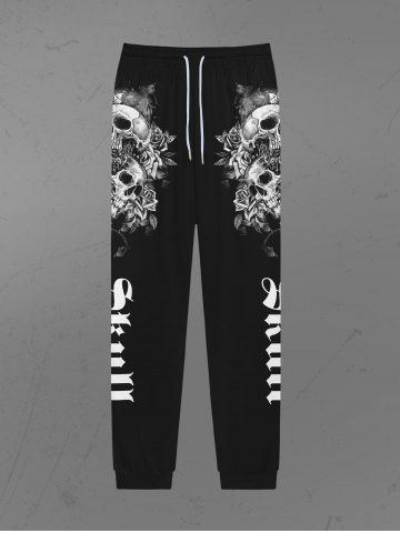 Gothic 3D Skulls Rose Flower Letters Side Print Pockets Drawstring Sweatpants For Men - Black - S