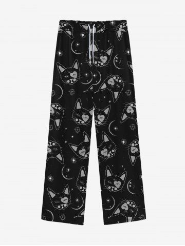 Gothic Cats Moon Stars Print Wide Leg Drawstring Sweatpants For Men - Black - 2xl