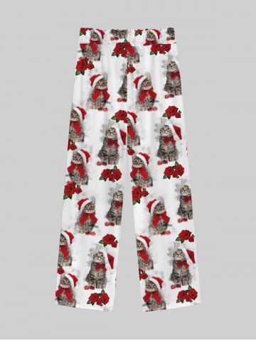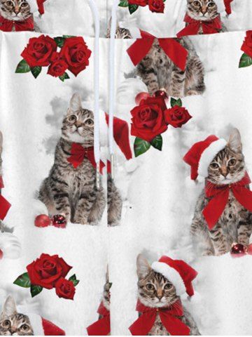 Gothic Christmas Hat Bowknot Cats Rose Flower Print Wide Leg Drawstring Sweatpants For Men - White - 5xl