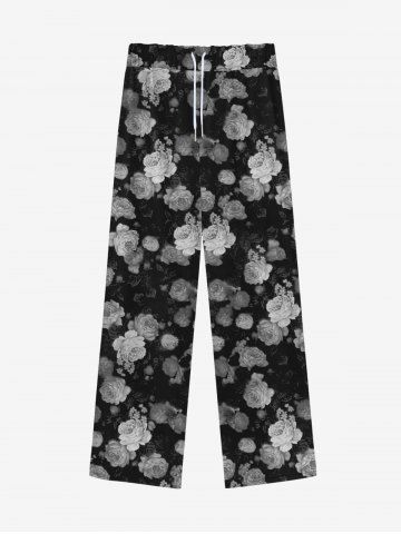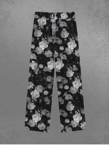 Gothic Rose Flowers Print Wide Leg Drawstring Sweatpants For Men - Black - Xl