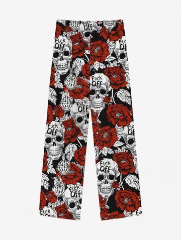 Gothic Skulls Skeleton Hand Rose Flower Letters Print Valentines Drawstring Wide Leg Sweatpants For Men - Red - L