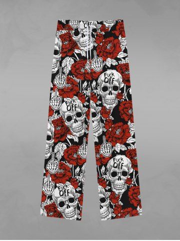 Gothic Skulls Skeleton Hand Rose Flower Letters Print Valentines Drawstring Wide Leg Sweatpants For Men - Red - 2xl