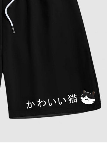 Men's Cat Japanese Characters Print Pockets Beach Shorts - Black - 4xl