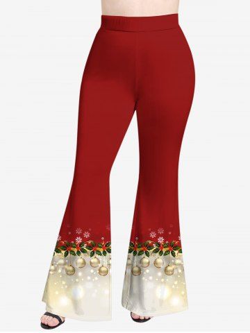 Plus Size Christmas Ball Leaf Glitter Colorblock Print Flare Pants - Red - L