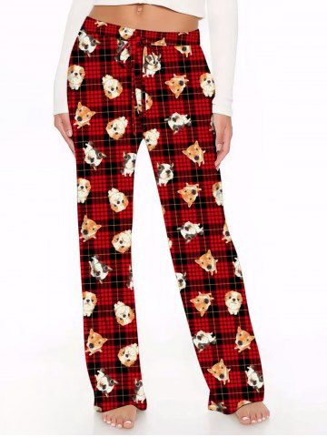 Plus Size Christmas Cute Dog Plaid Print Drawstring Wide Leg Pants - Red - Xs
