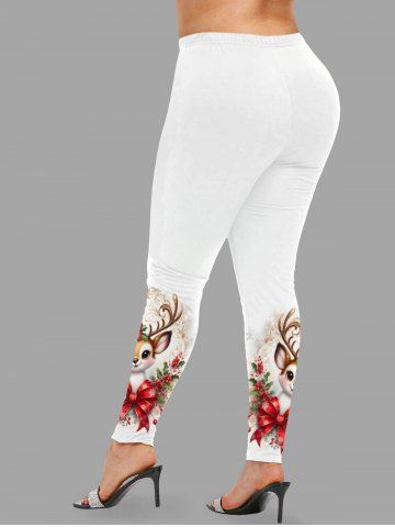 Plus Size Christmas Elk Bowknot Flowers Holly Fruit Print Leggings - White - 3x
