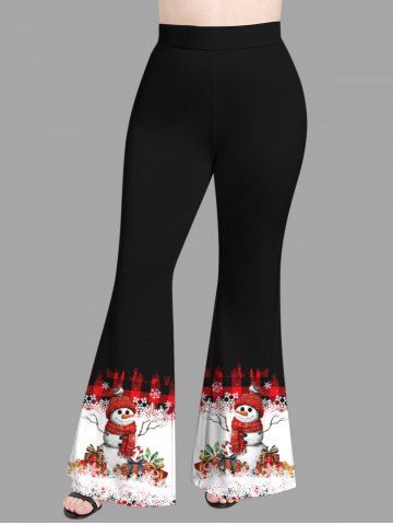Plus Size Christmas Gift Snowflake Snowman Plaid Print Flare Pants - Black - 3x