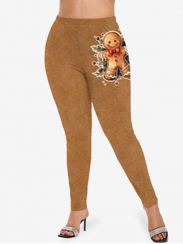 Plus Size Christmas Gingerbread Holly Fruit Leaf Print Leggings - Light Brown - 2x