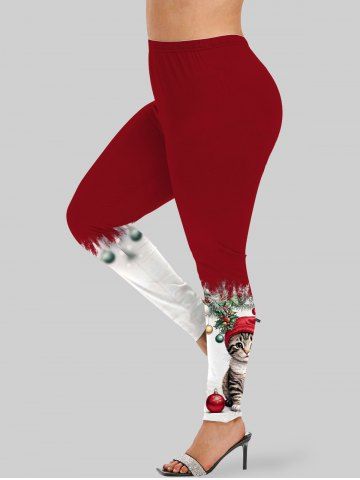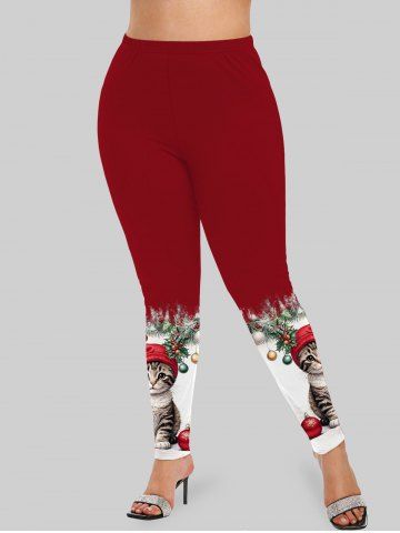 Plus Size Christmas Hat Ball Cat Holly Print Leggings - Red - L