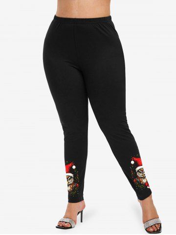 Plus Size Christmas Hat Ball Leaves Bowknot Owl Print Leggings - Black - 3x