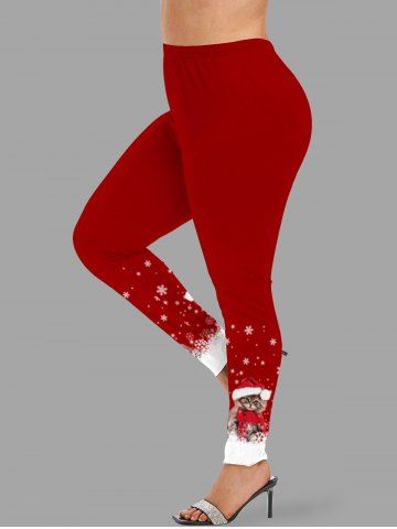 Plus Size Christmas Hat Cat Snowflake Colorblock Print Leggings - Red - L