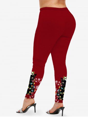 Plus Size Christmas Light Hat Cat Snowflake Glitter 3D Print Leggings - Deep Red - M