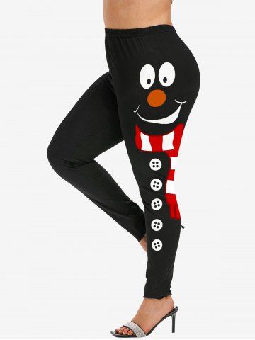 Plus Size Christmas Snowman Face Scarf Buttons Print Leggings - Black - M