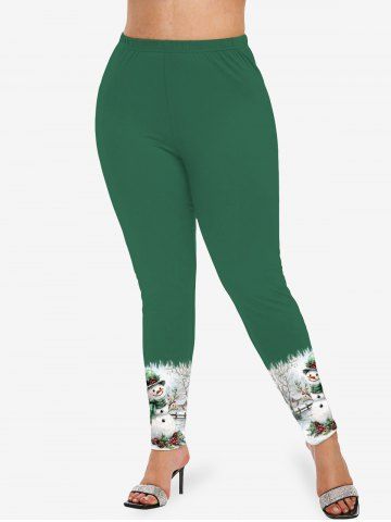 Plus Size Christmas Snowman Holly Printed Skinny Leggings - Green - 5x
