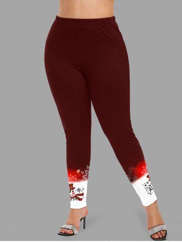 Plus Size Christmas Snowman Snowflake Ombre Colorblock Print Leggings - Deep Red - 3x