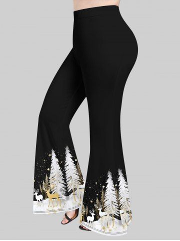 Plus Size Christmas Tree Elk Galaxy Print Flare Pants - Black - 5x